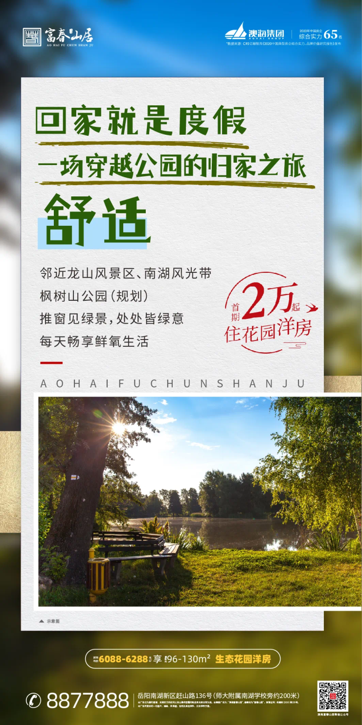 【澳海集团】23载19城104座品质住宅“岳阳澳海富春山居”邻近龙山风景区/南湖风光带推窗见绿景 处处皆绿意每天畅想鲜氧生活建面约96㎡生态花园洋房先睹为快