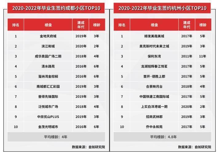 而新一线城市的毕业生们则展现了与一线毕业生不一样的聚集形态,他们更为集中的居住在城市的高新区里,偏好的小区也更为“年轻”,以天津为例,毕业生们签约的“TOP10”小区楼龄仅为2.6年。
