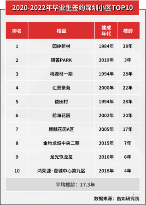 同时,深圳也是毕业生签约“TOP10”小区平均楼龄最长的城市,位列前10名小区的平均楼龄为17.3年。而紧随其后的是北京、广州、上海三个城市,位列前10名小区的平均楼龄为12.7年、12.1年与9.8年。