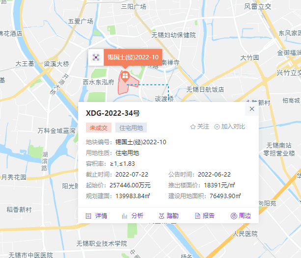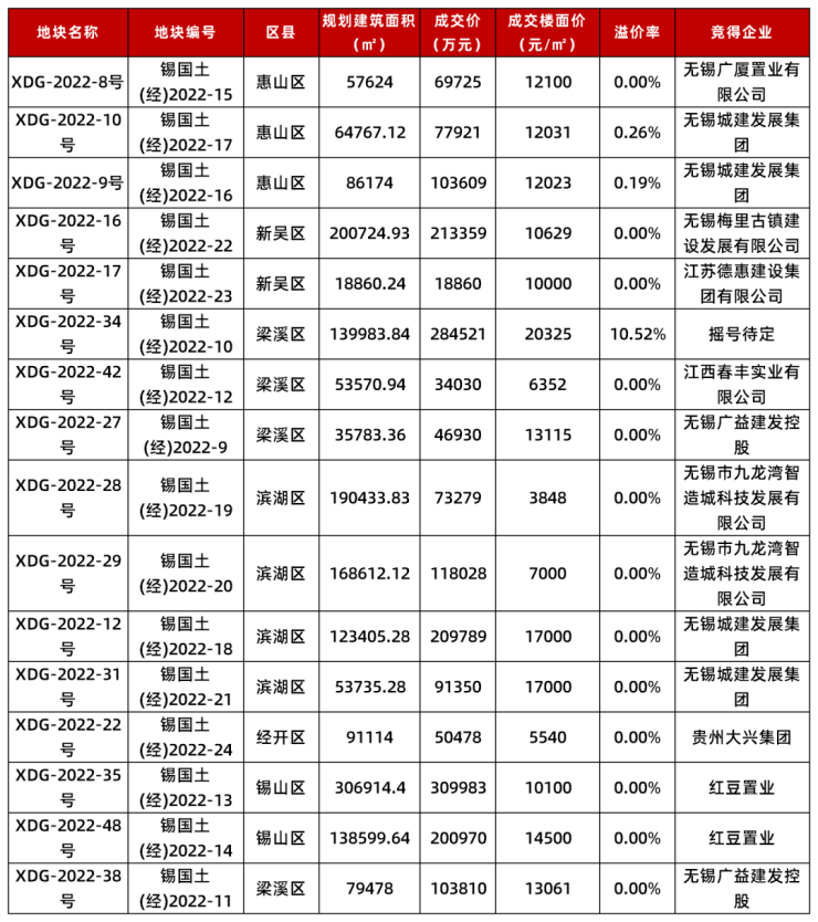 XDG-2022-9号地块(锡国土(经)2022-16)以103609万元的成交价、12023元/平方米的成交楼面价、0.19%的溢价率由无锡城建发展集团竞得。