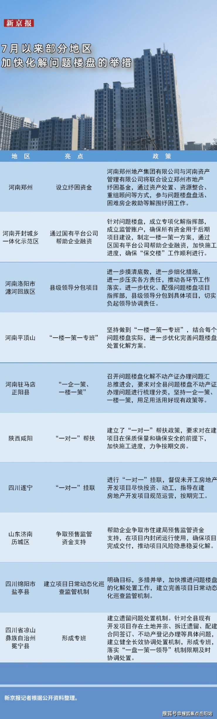 与此同时,全国各地正加快出台相关政策,推进问题楼盘化解处置工作。尤其是河南省,除了省会郑州市外,包括开封市、平顶山市、洛阳市瀍河回族区、驻马店市正阳县等地均针对问题楼盘出台了相应举措。