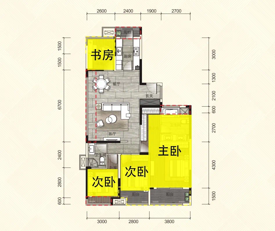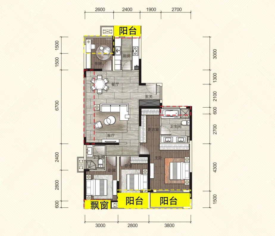 客餐厅一体,形成6.7m大横厅。不仅大幅提升室内空间的尺度感和美学感,让居家更加气派。当然,还有更大幅度的采光和景观视野,美丽清晨,当一家人起床后,靓丽的阳光已经晒满整个屋子,开启一整天的好心情。