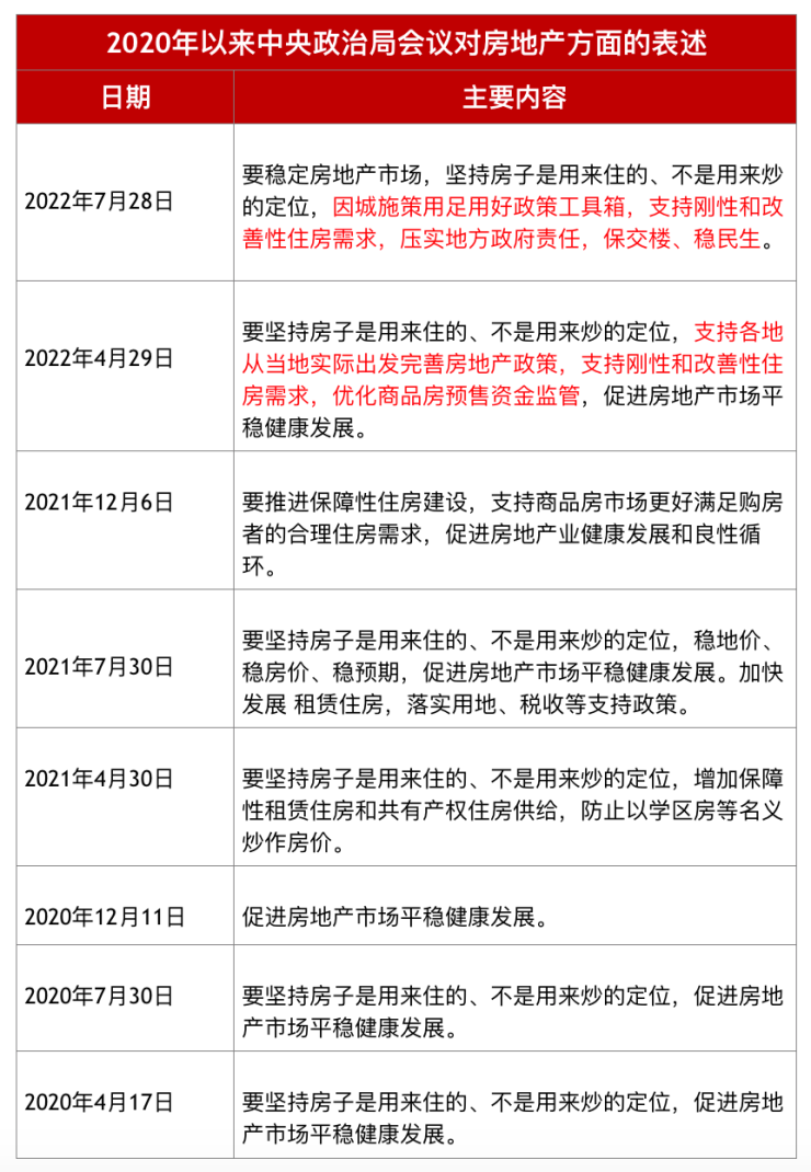 中共中央政治局7月28日召开会议,分析研究当前经济形势,部署下半年经济工作。会议指出,要稳定房地产市场,坚持房子是用来住的、不是用来炒的定位,因城施策用足用好政策工具箱,支持刚性和改善性住房需求,压实地方政府责任,保交楼、稳民生。