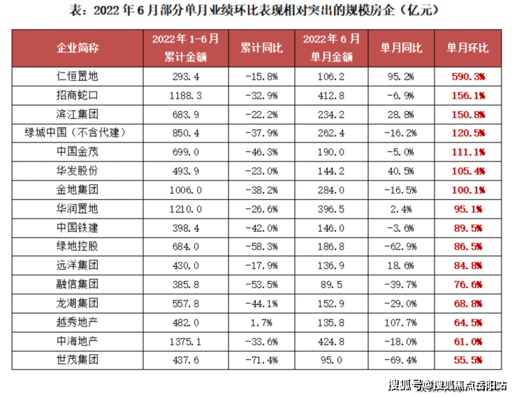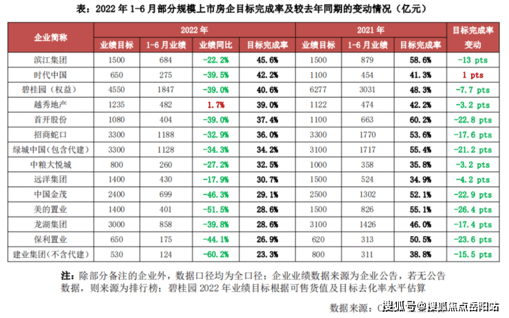 克而瑞在报告中表示,6月份,部分规模房企项目去化情况较佳、单月业绩表现突出,如中海、华润、绿城、招商、金地、绿地、滨江、金茂、越秀、华发、仁恒等企业单月业绩环比增幅均在60%以上。从规模房企上半年业绩目标的完成情况来看,在公开披露年度目标的规模上市房企中,多数企业截至6月末的目标完成率不足40%,有近半数企业甚至不足30%。绝大多数企业上半年的目标完成度均大幅低于2021年同期,部分企业目标完成度较2021年同期的降幅大于20个百分点。