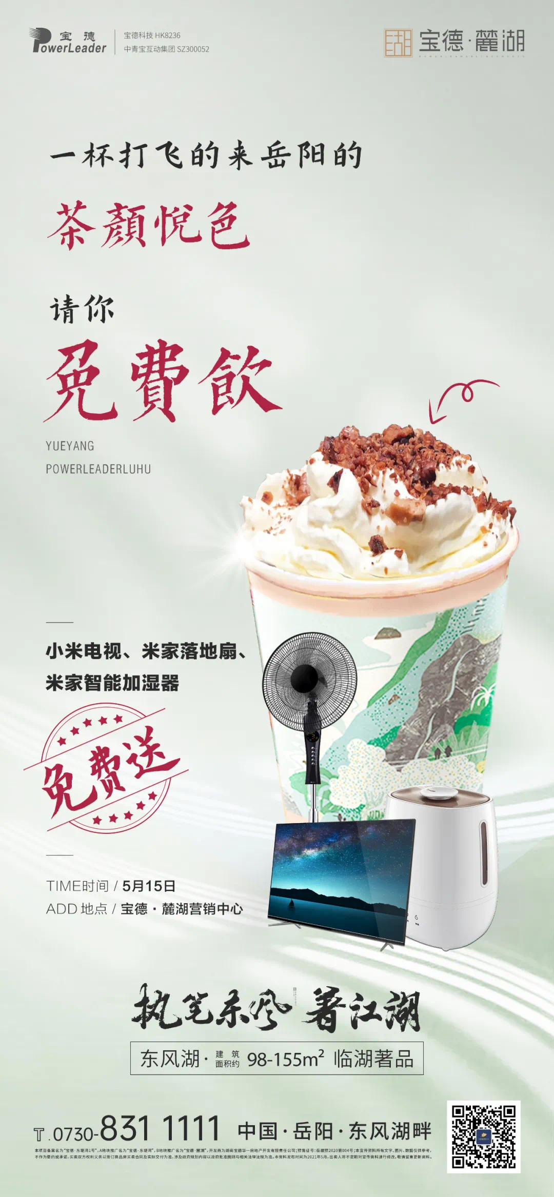 在长沙人手五杯的网红茶颜,周末打着飞的与你相约岳阳东风湖畔。武汉排队8小时,炒到500元一杯的茶颜,5.15日,宝德麓湖请你免费饮。现场更有小米电视、米家落地扇、米家智能加湿器等多重豪礼送不停。