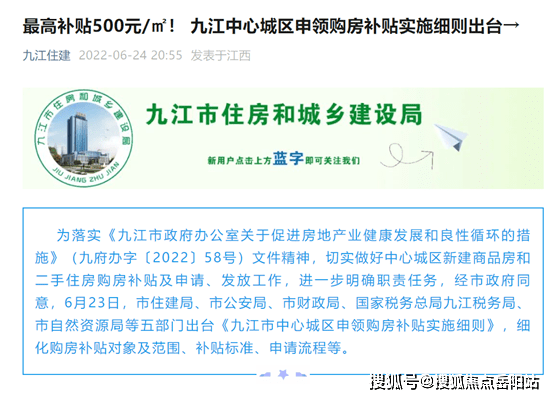 6月24日,九江市住建局等五部门发布《九江市中心城区申领购房补贴实施细则》,细化购房补贴对象及范围、补贴标准、申请流程等。
