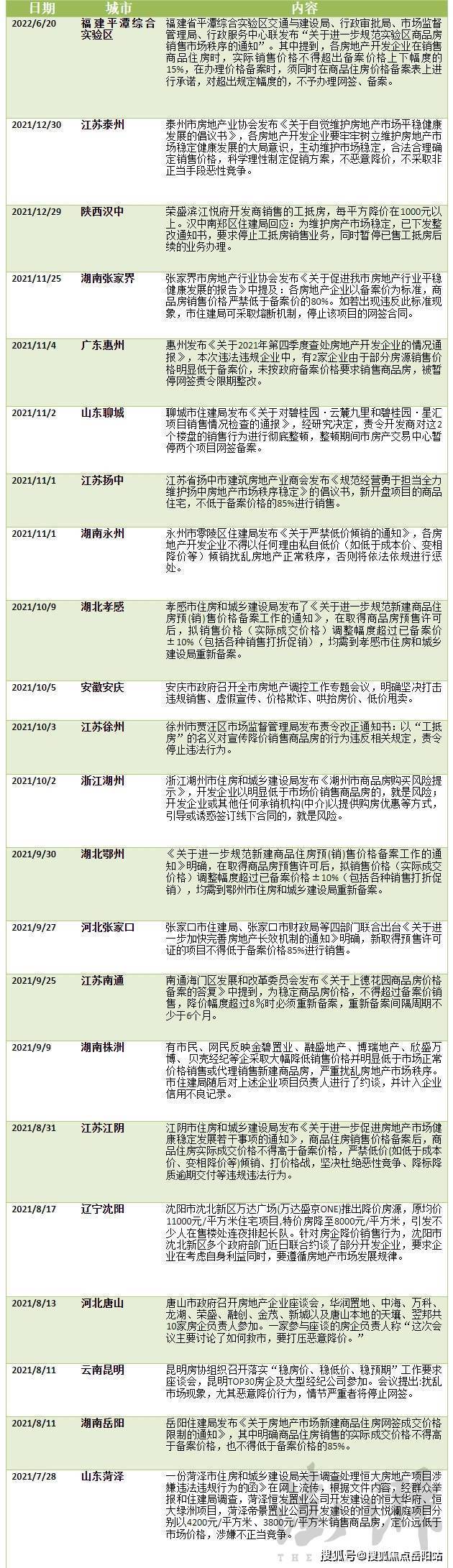据澎湃新闻不完全统计,去年下半年以来,至少包括山东菏泽、湖南岳阳、云南昆明、河北唐山、辽宁沈阳、江苏江阴、湖南株洲、河北张家口、湖北鄂州 、江苏徐州 、江苏泰州、安徽安庆、浙江湖州、湖南永州、湖北孝感、江苏扬中、江苏南通、山东聊城、广东惠州、湖南张家界、陕西汉中、福建平潭综合实验区等22个地方发布政策或引导房企不得随意降价销售。
