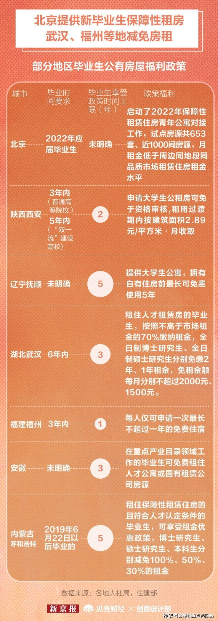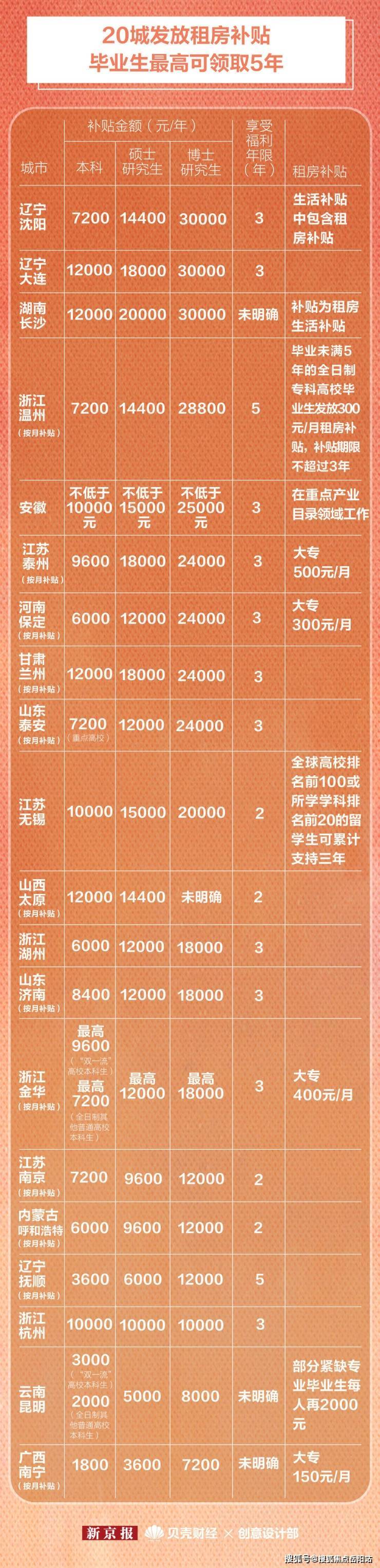 对于未享受到公租房、保障性租房等住房优惠政策的毕业生们,新京报贝壳财经记者梳理数据发现,多地同样推出租房补贴政策。