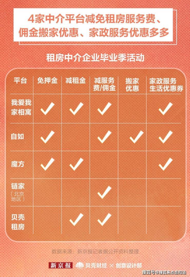 新京报贝壳财经记者梳理发现,今年自如、魔方、我爱我家旗下的相寓均启动毕业生签约免押金活动,此外还有机会减免服务费或租房佣金。部分平台还提供搬家优惠券和家政服务优惠券,降低毕业生的搬家成本,帮助他们顺利入住自己的“小窝”。