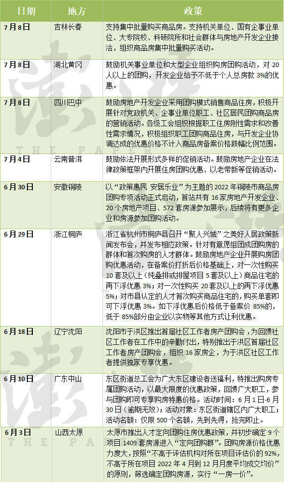以吉林长春为例,今年7月8日,吉林省长春市政府办公厅发布《进一步促进房地产市场平稳发展若干措施的通知》,《通知》提到,支持集中批量购买商品房。支持机关单位、国有企事业单位、大专院校、科研院所和社会群体与房地产开发企业接洽,组织商品房集中批量购买活动。团购房需取得商品房预售许可,房地产开发企业不得低于成本价格销售。