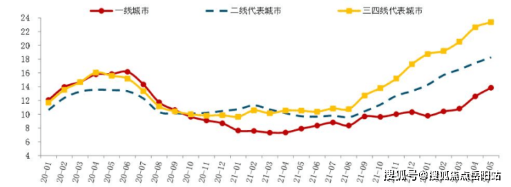 其中,截至2022年5月底,按近6个月月均销售面积计算,一线城市短期库存出清周期13.9个月;二线代表城市出清周期18.3个月,较2021年末延长4.9个月,短期库存面临一定压力;三四线代表城市出清周期23.4个月,较2021年末延长6.1个月,市场库存去化压力较大。
