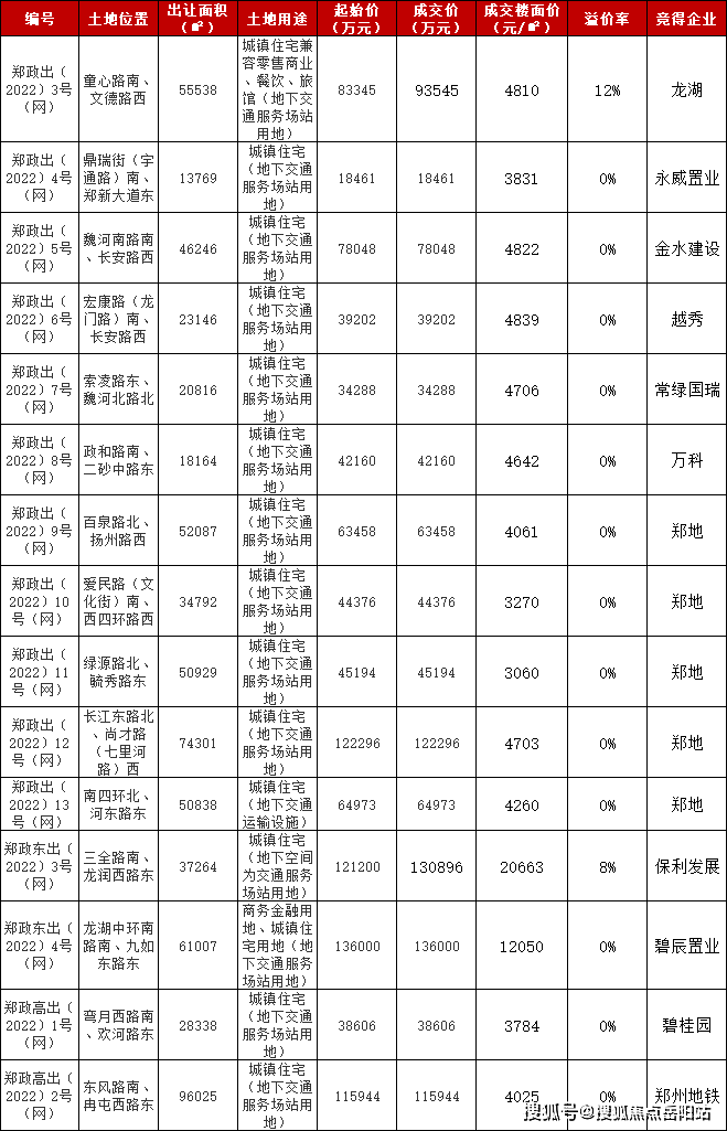 郑政东出〔2022〕3号(网)地块由保利发展以13.09亿元竞得,成交楼面价20663元/平方米,溢价率8%。该地块起始价12.12亿元,起始楼面价19132元/平方米。该地块位于三全路南、龙润西路东,建设用地面积37264平方米,规划建筑面积63349平方米,用地性质为城镇住宅(地下空间为交通服务场站用地)。