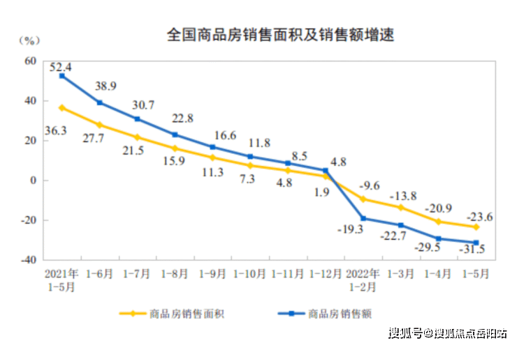 国家统计局数据显示,1—5月份,商品房销售面积50738万平方米,同比下降23.6%;其中,住宅销售面积下降28.1%。商品房销售额48337亿元,下降31.5%;其中,住宅销售额下降34.5%。