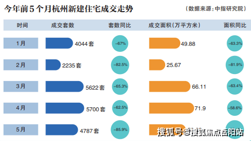 据中指研究院统计数据显示,杭州新房成交还是处于降温态势。今年5月,杭州新建住宅成交4787套,同比下降85.9%;成交面积58.63万平方米,同比下降85.1%。