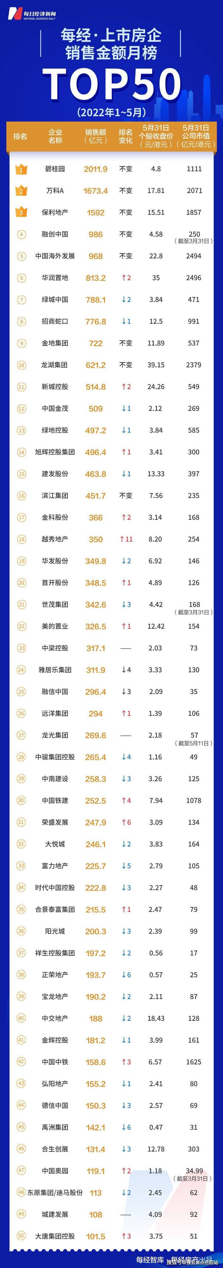 每经数读| 5月TOP50房企业绩无转热迹象 千亿阵营依然只有碧桂园、万科、保利