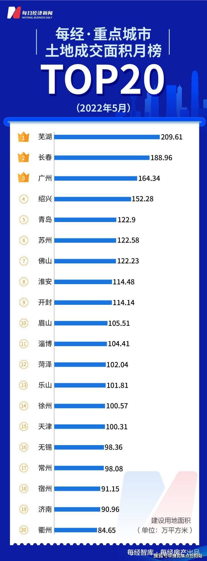 其中出让面积排名前列名的城市为芜湖,成交面积209.61万平方米,长春、广州紧随其后。