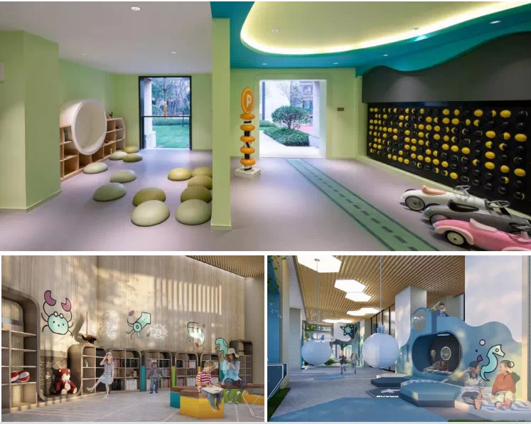 阳光草坪、色彩丰富的地面设计,让孩子们有很强的空间体验感;全龄游乐区、户外羽毛球场,让孩子们在玩乐之余,获得社交、智力、体力的发展,也让家长能够随时观察孩子的动态和情况,见证孩子的进步,拉进亲子关系。