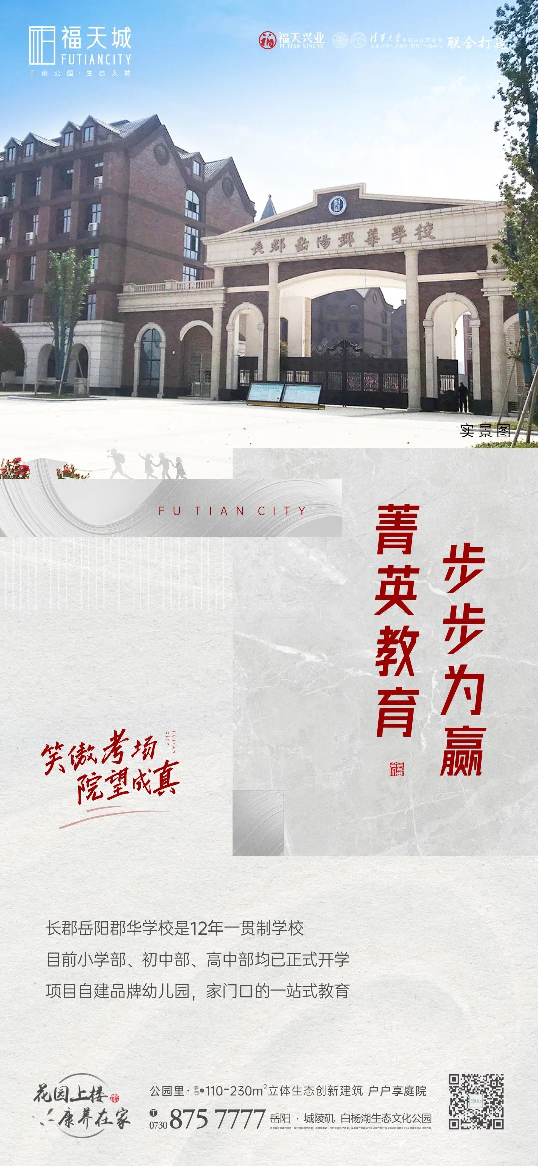 名校近一步,成才进一步 福天城紧邻长郡岳阳郡华学校 咫尺悦享12年一站式菁英教育 自贸芯·公园里·郡华旁·生态城 建面约110-230㎡立体生态创新建筑 户户享庭院,让你院望成真