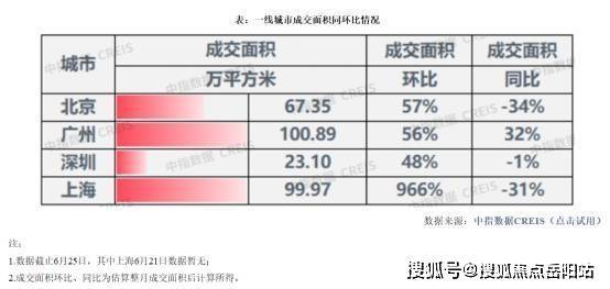 六月一线城市成交量整体环比上升,为122.1%,分城市来看,上海涨幅较大,为966%;北京次之,为57%,广州升幅56%,位列第三。同比来看,整体成交下行,降幅为16.1%,其中广州上升,增幅为32%;北京降幅较大,为34%。