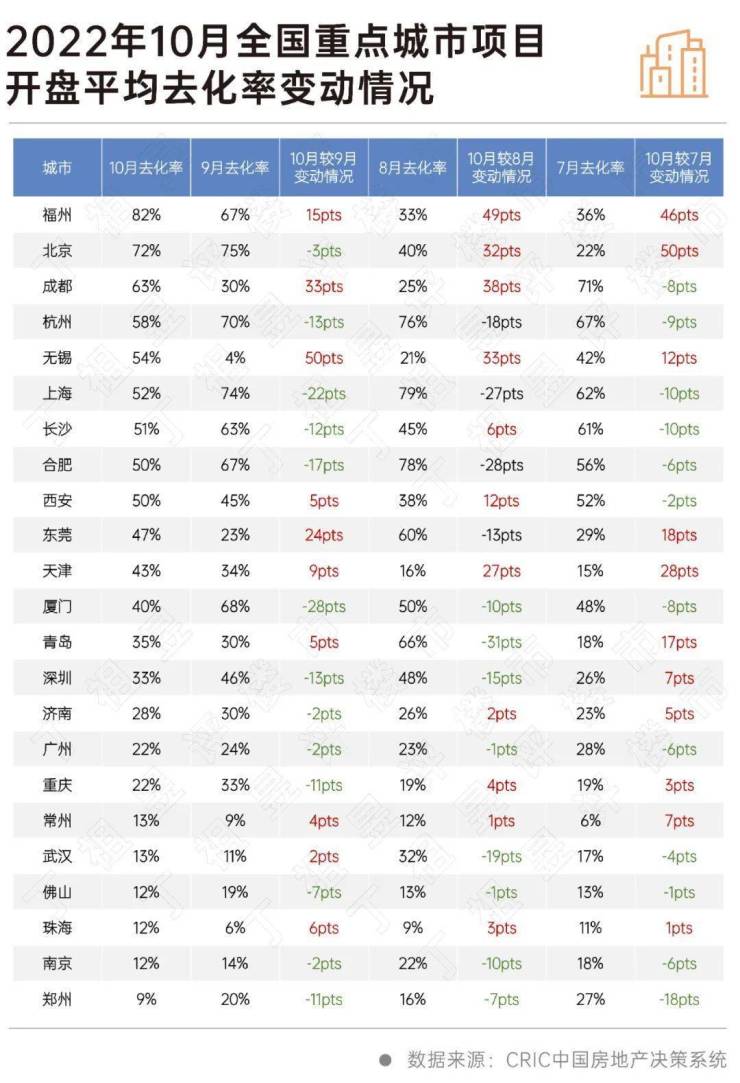 具体来看,据克而瑞统计,10月23个重点城市平均开盘去化率环比上涨的城市有10个,平均开盘去化率位列前三位的是福州、北京和成都,平均开盘去化率均超60%,杭州、无锡、上海、长沙、合肥和西安的开盘去化率均超50%。其中,杭州、上海、长沙、合肥等热点城市的开盘去化率出现明显回调。