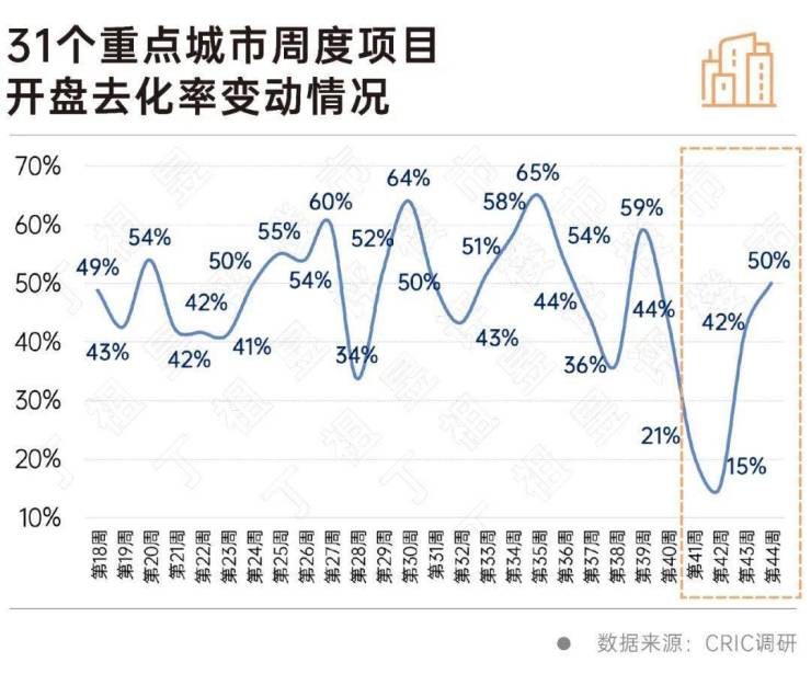 在此情况下,据CRIC调研数据显示,重点31城周平均开盘去化率并不平稳,甚至波动巨大。9月末10月初,项目开盘去化率一度跌至15%。随后,部分城市核心区域供应放量,适销对路产品集中入市,结构性拉升了市场热度,至10月最后一周,去化才稳步回升。