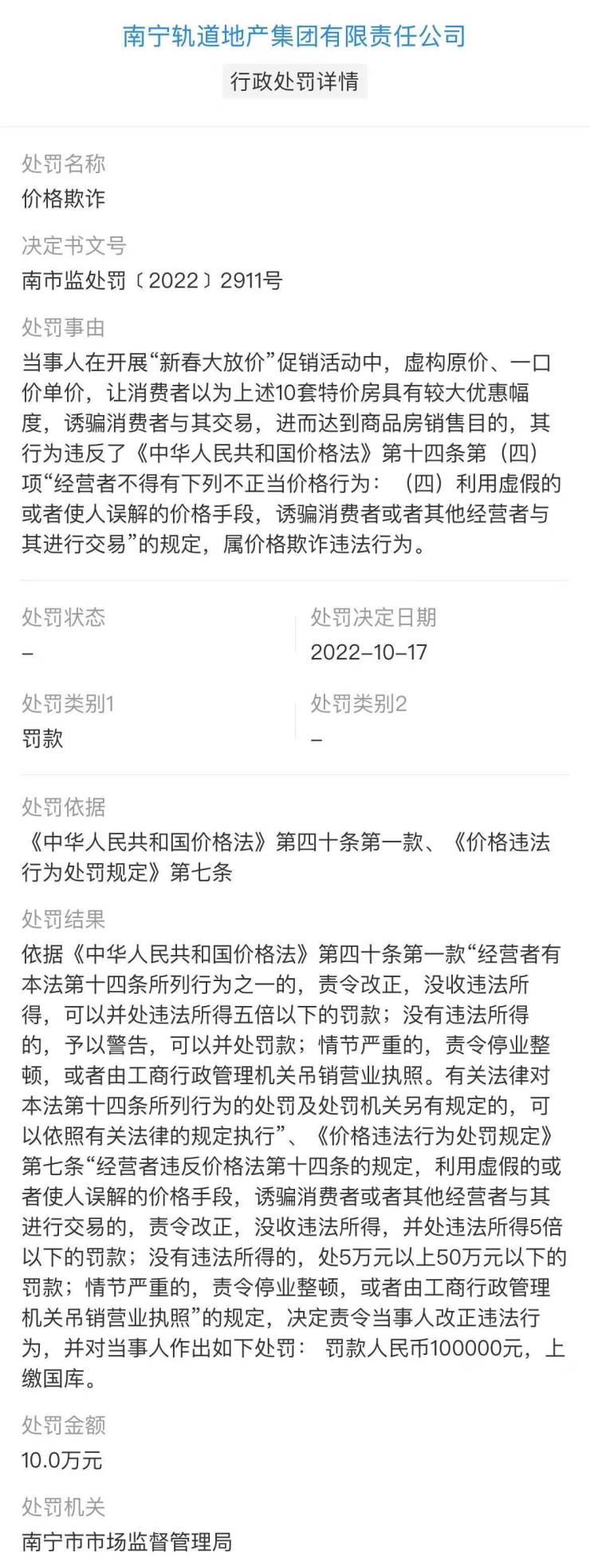2022年10月,南宁轨道地产曾因价格欺诈被南宁市市场监督管理局处以行政处罚。处罚事由表明,当事人在开展“新春大放价”促销活动中,虚构原价、一口价单价,让消费者以为10套特价房具有较大优惠幅度,诱骗消费者与其交易,进而达到商品房销售目的,其行为违反了《中华人民共和国价格法》,属价格欺诈违法行为。