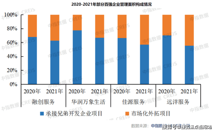 事实上,虽然经过多年发展,物业企业在管面积中来自母地产公司开发项目的比例仍占据主导。以部分物业企业为例,据中指物业研究统计,截至2021年12月31日,融创服务、华润万象生活、佳源服务、远洋服务等企业的在管面积中来自关联地产开发企业的占比仍保持在50%以上。