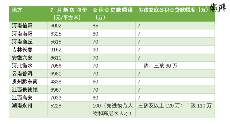 据澎湃新闻不完全统计,在上调公积金贷款额度的城市中,以职工(含家庭)首次购买100平方米的首套住房为例,参照当地新房均价,至少包括河南信阳、河南南阳、河南商丘、湖南永州、吉林长春、安徽六安、河北衡水、云南普洱、贵州黔东南、江西景德镇、江西高安等地公积金贷款最高贷款额度可基本覆盖刚需购房金额。