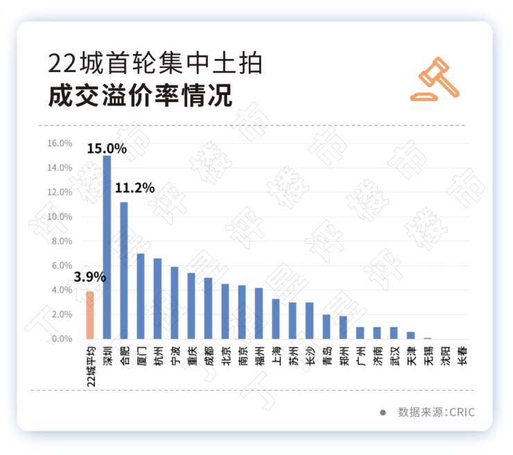 从土地成交溢价率来看,克而瑞数据显示,今年22城首批集中土拍的平均溢价率为3.9%,仅深圳和合肥的平均溢价率超过了10%,分别为15%和11.2;南京、福州、上海、苏州、长沙等16个城市的土拍平均溢价率低于5%。