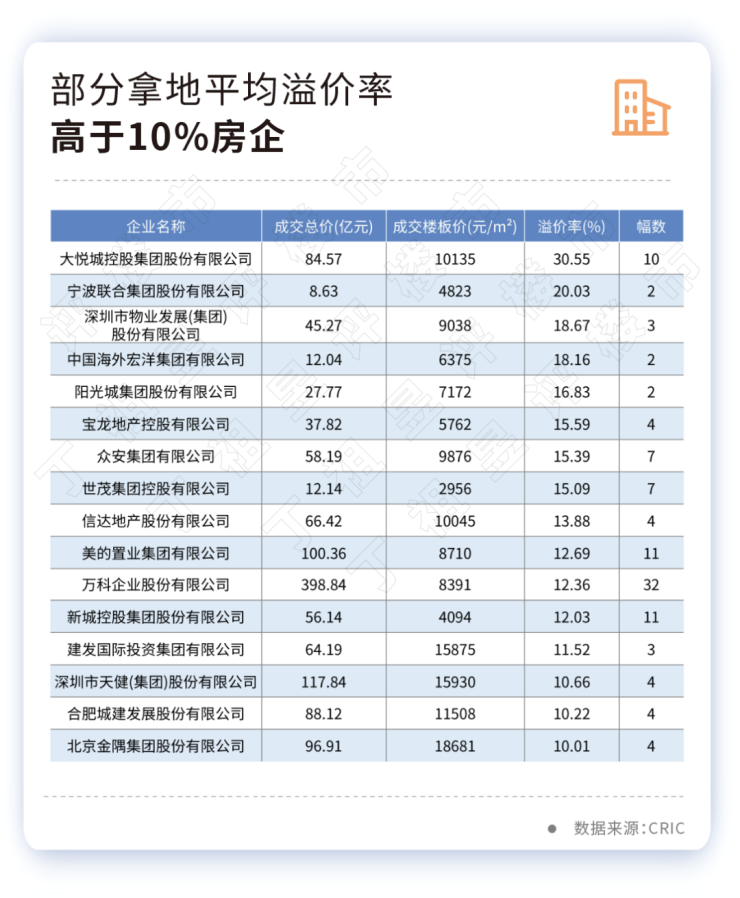 部分拿地平均溢价率高于10%房企 来源:CRIC