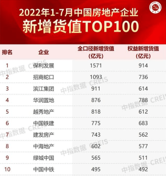 2022年1-7月中国房地产企业新增货值top100截图 来源:中指研究院