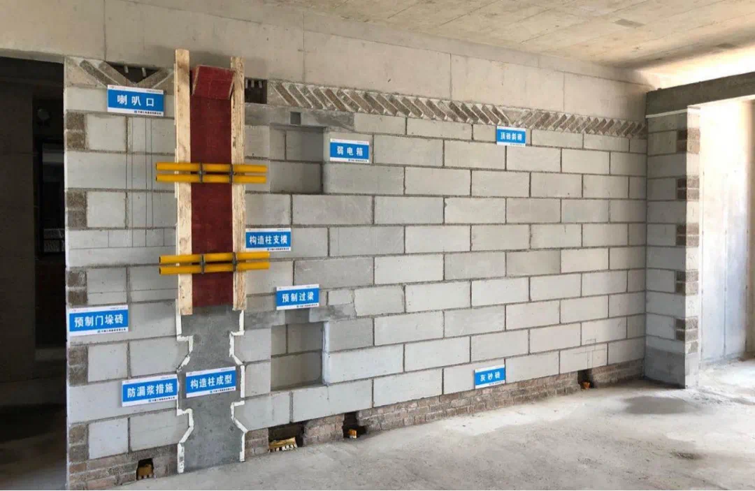 项目标准层采用精确加气块,砌筑完成后可达到清水墙效果,与砼墙一起进行薄抹灰施工。