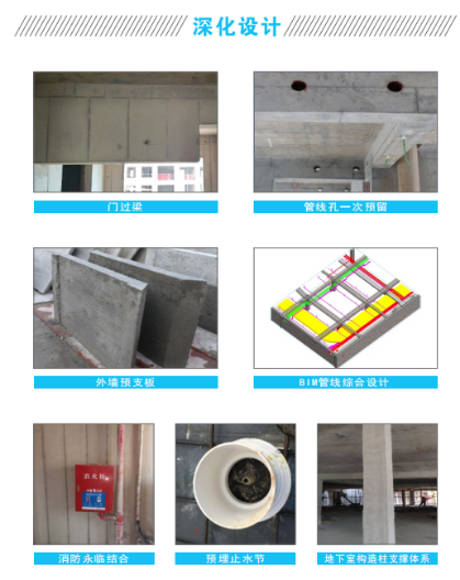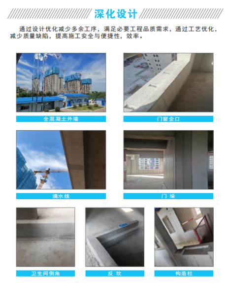主楼标准层深化设计为全混凝土外墙,采用新一代拉片式铝模与全模块附着升降脚手架施工工艺。通过铝模工艺深化,滴水线、圆弧角、管槽全部为铝模内倒模一次浇筑成型,方便后续施工,减少成品保护难度,铝窗设置企口便于后续铝窗安装,减小渗漏隐患,同时砌体构造柱、门窗下挂梁、厨房卫生间反坎等二次构件随主体结构一次成型。